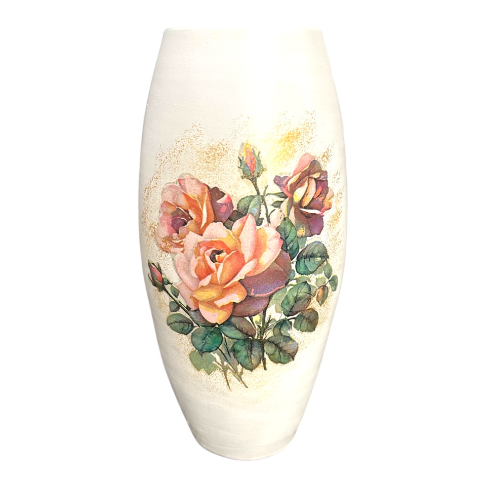 Această Vaza cu trandafiri este perfectă pentru a aduce un strop de rafinament și căldură în orice încăpere. Designul floral completează subtil liniile clasice ale vazei, creând o piesă decorativă versatilă, ideală pentru a înfrumuseța spațiile interioare. Potrivită pentru flori naturale, uscate sau ca element de decor independent, această vază va aduce un plus de eleganță și farmec decorului casei tale.