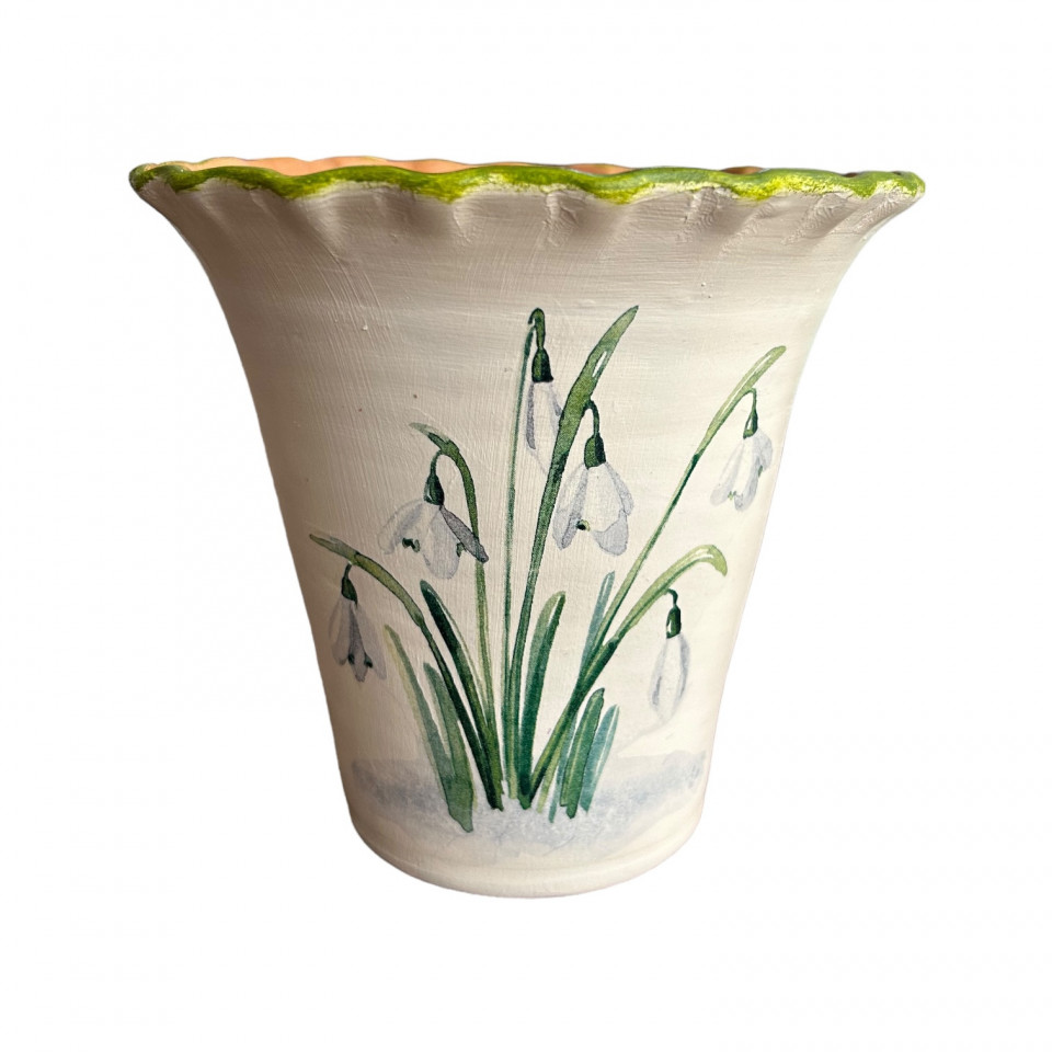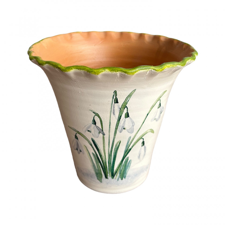 Vaza de lut, alba cu ghiocei
