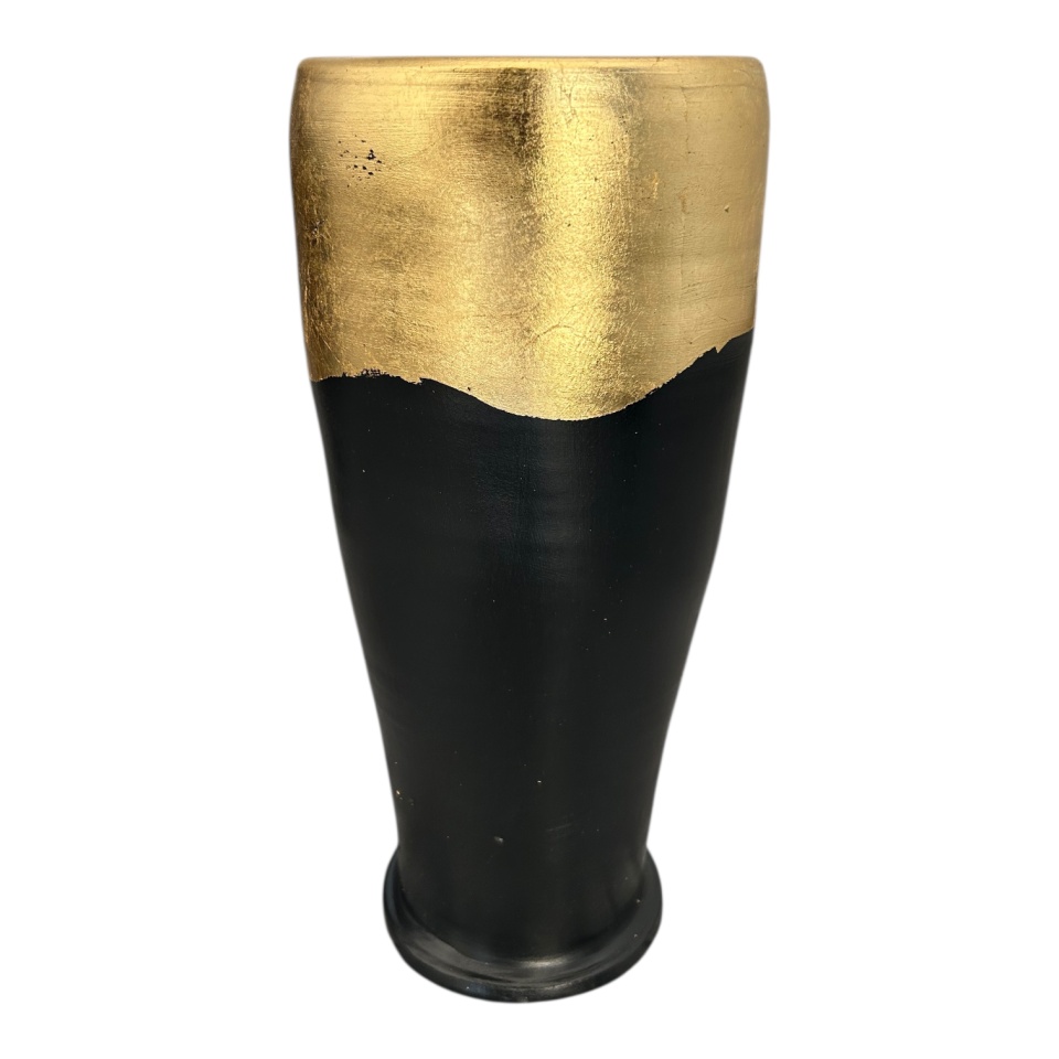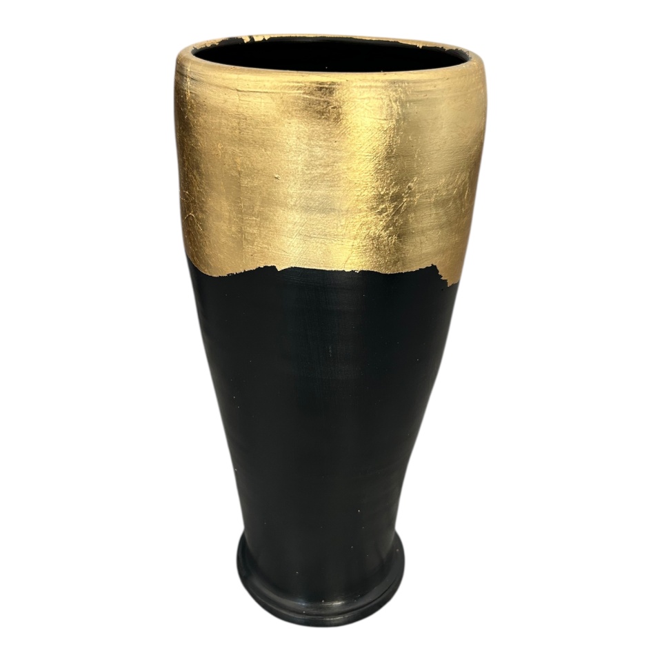 Această vază de 30 cm este o combinație între simplitate modernă și detaliu de lux. Realizată manual din ceramică la Marginea, are un finisaj negru elegant, pus în valoare de partea superioară decorată cu foiță de aur aplicată manual.