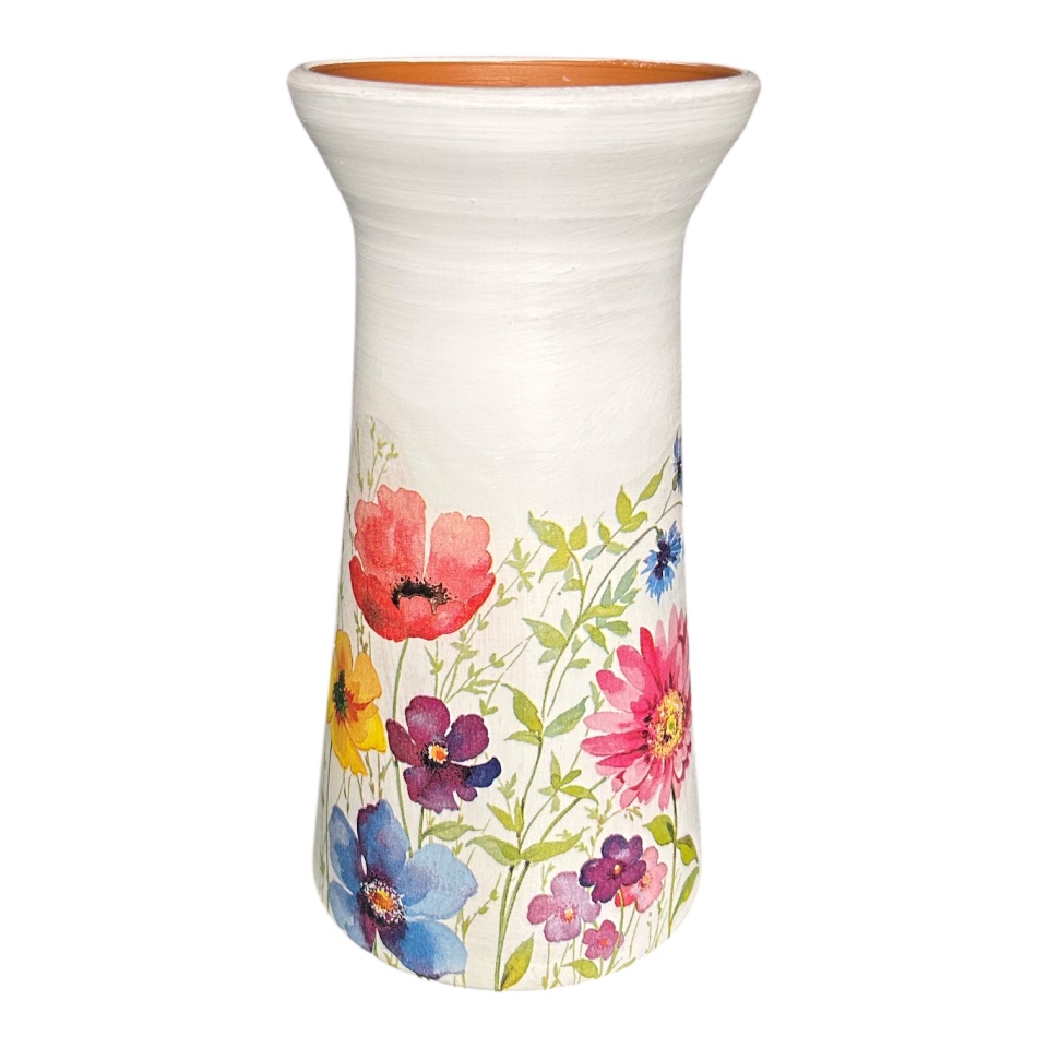 Cu un design luminos și plin de energie, această vază albă din ceramică cu flori de camp aduce un strop de vară în orice încăpere. Detaliul floral oferă culoare și prospețime, păstrând în același timp un aspect curat și echilibrat.