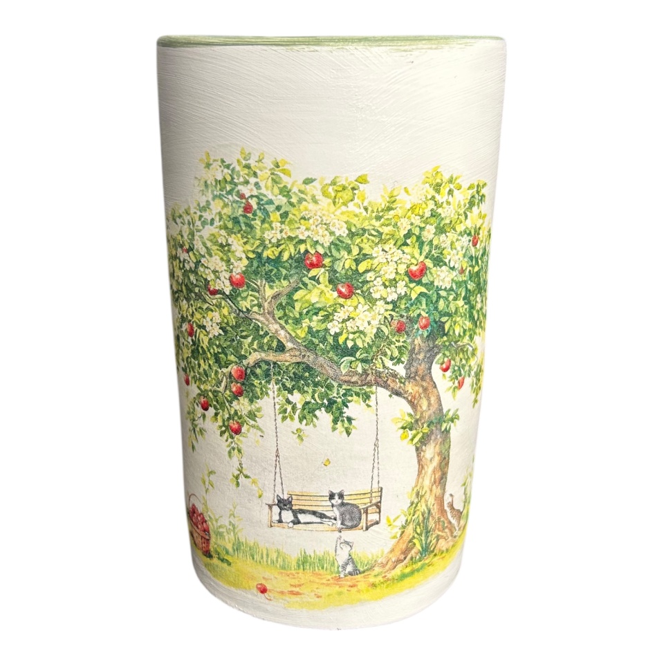 Aceasta vaza decorativa reda frumusetea unei zile senine, cu un copac umbros, un leagan care aduce nostalgie si mici siluete de animale ce dau viata peisajului. Designul cald si echilibrat inspira liniste, relaxare si apropiere de natura, transformand orice spatiu intr-un colt plin de armonie. Realizata din ceramica alba si avand o inaltime de 20 cm, vaza se potriveste perfect in decoruri de primavara sau vara, adaugand un accent natural si elegant in living, dormitor sau birou. Poate fi folosita pentru flori proaspete, ramuri verzi sau ca obiect decorativ de sine statator. O vaza care transmite calm, echilibru si bucuria momentelor simple.