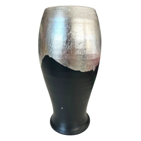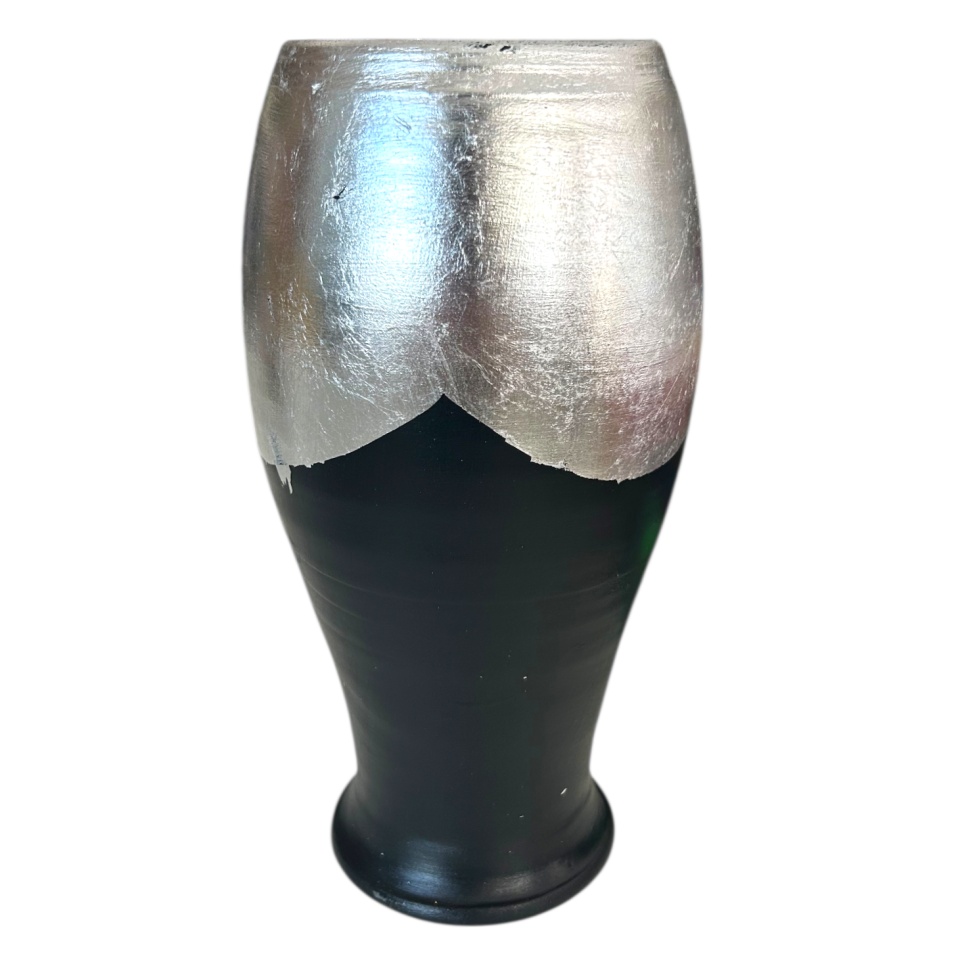 Vaza de flori din lut decorată cu foita de argint poate fi folosită pentru aranjamente florale, dar și ca obiect de artă de sine stătător, aducând un plus de eleganță oricărui spațiu.