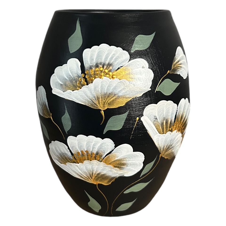 Această vază are un design elegant, cu linii delicate și un finisaj mat. Formele atent lucrate oferă o senzație de simplitate rafinată. Suprafața prezintă elemente decorative pictate manual, accentuând meșteșugul tradițional. Dimensiunile sale o fac potrivită pentru decoruri interioare variate, oferind un aspect sofisticat oricărui spațiu.