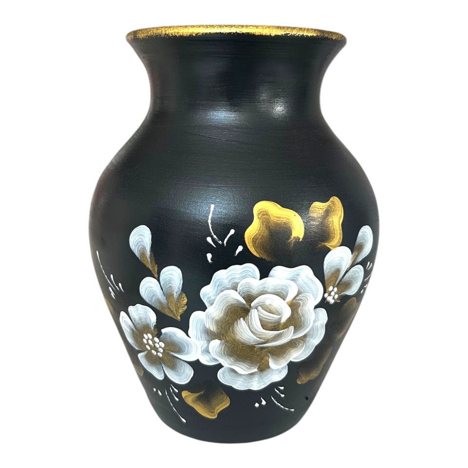 Această vază din ceramică, realizată și pictată manual cu o atenție deosebită la detalii, reprezintă o combinație perfectă între meșteșug tradițional și design elegant. Cu un finisaj impecabil și motive pictate manual, este ideală pentru a aduce un plus de rafinament oricărui decor. Perfectă pentru flori naturale sau ca piesă decorativă de sine stătătoare, această vază adaugă un farmec aparte locuinței tale