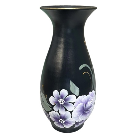 Vază sofisticată, realizată manual, se remarcă prin florile mov delicate care strălucesc pe un fundal negru mat. Accentele aurii rafinate completează armonios designul, oferind o combinație perfectă între eleganță și modernitate. Detaliile florale pictate cu măiestrie adaugă un plus de farmec, transformând vaza într-un accesoriu ideal pentru decorarea unei camere elegante.