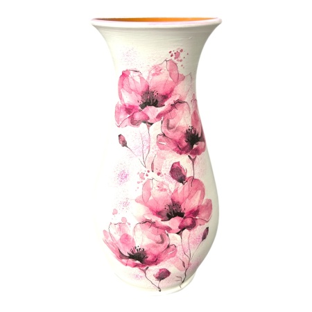 Această vază elegantă, cu un fundal alb și decorată cu un frumos model floral, este perfectă pentru a aduce un strop de rafinament și căldură în orice încăpere. Designul floral completează subtil liniile clasice ale vazei, creând o piesă decorativă versatilă, ideală pentru a înfrumuseța spațiile interioare. Potrivită pentru flori naturale, uscate sau ca element de decor independent, această vază va aduce un plus de eleganță și farmec decorului casei tale.