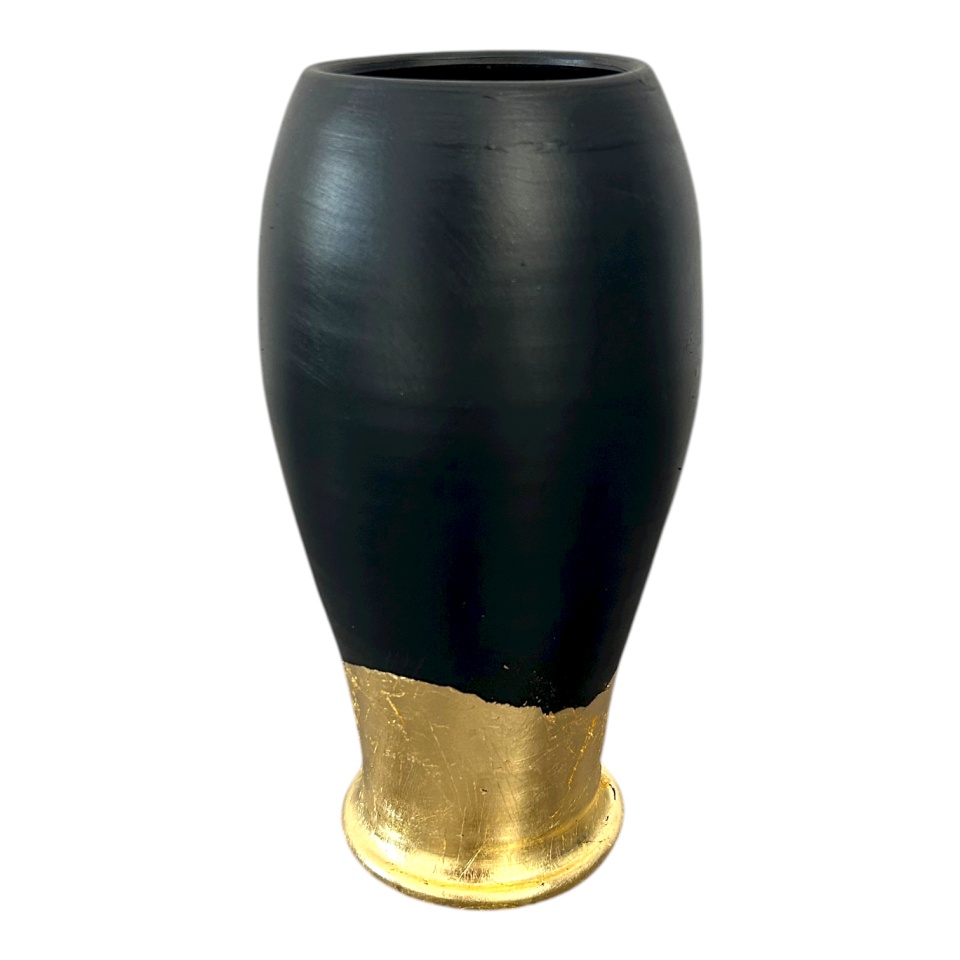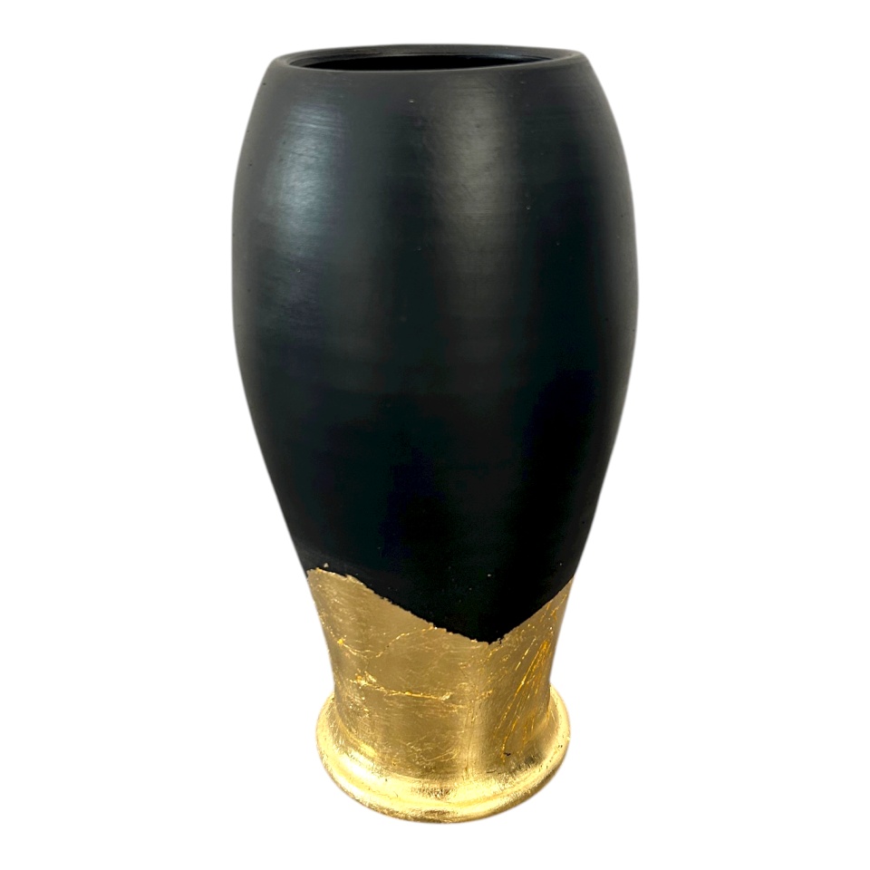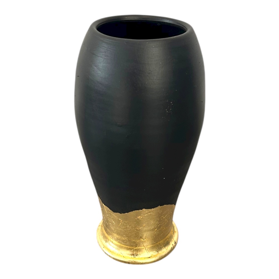 Vază decorativă din ceramică, realizată într-un stil modern, cu aplicare manuală de foiță de aur pentru un efect elegant și rafinat. Cu o înălțime de 25 cm, această piesă se potrivește în interioare contemporane, clasice sau minimaliste, aducând un accent vizual distinct. Poate fi utilizată atât ca obiect decorativ singular, cât și pentru expunerea florilor uscate sau naturale. Este o alegere potrivită pentru living, dormitor, birou sau spații de reprezentare.