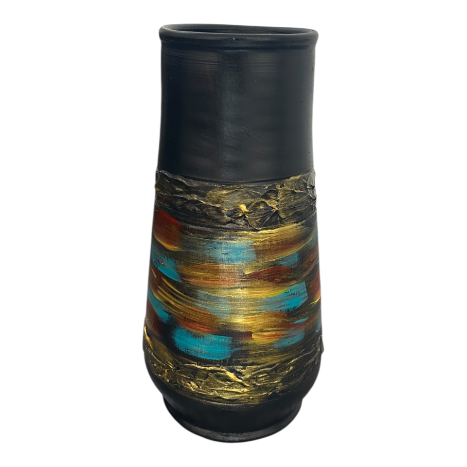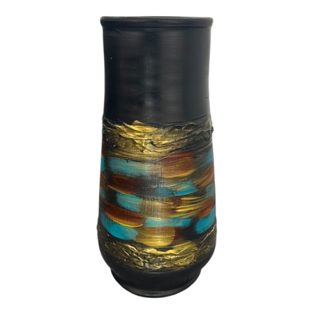 Vază decorativă modernă, realizată din ceramică, cu design artistic și un finisaj texturat. Vaza este decorată cu accente de culori metalice, aplicate într-un mod abstract care oferă un efect vizual dinamic și sofisticat. Forma sa este ușor conica adaugă o notă de originalitate. Ideală pentru a fi folosită atât ca obiect decorativ de sine stătător, cât și pentru a expune flori sau aranjamente florale, această vază va aduce un plus de eleganță și stil oricărui spațiu. Perfectă pentru decoruri moderne sau contemporane.