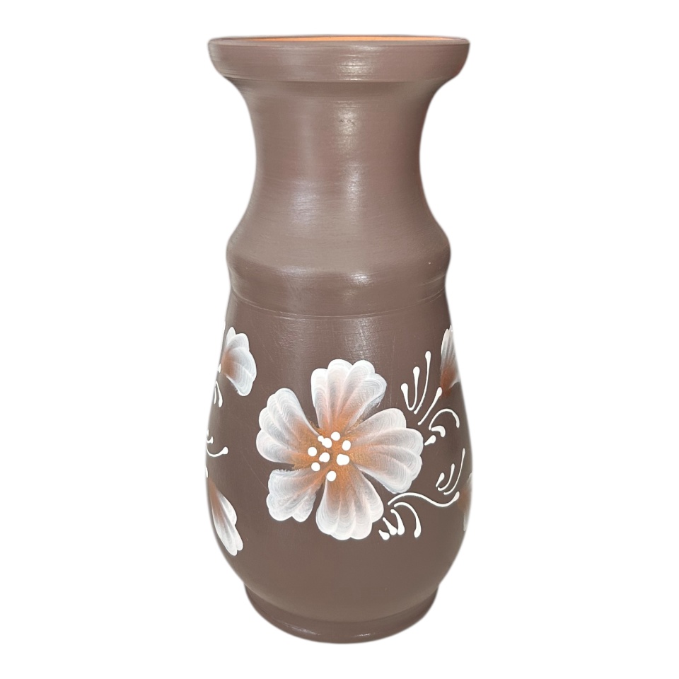 Această vază maro, cu o înălțime de 25 cm, are un design simplu și echilibrat, evidențiat prin decorul pictat manual cu flori albe. Contrastul delicat dintre fondul cald și florile luminoase conferă piesei un aspect natural și liniștit, fără a fi încărcat vizual.