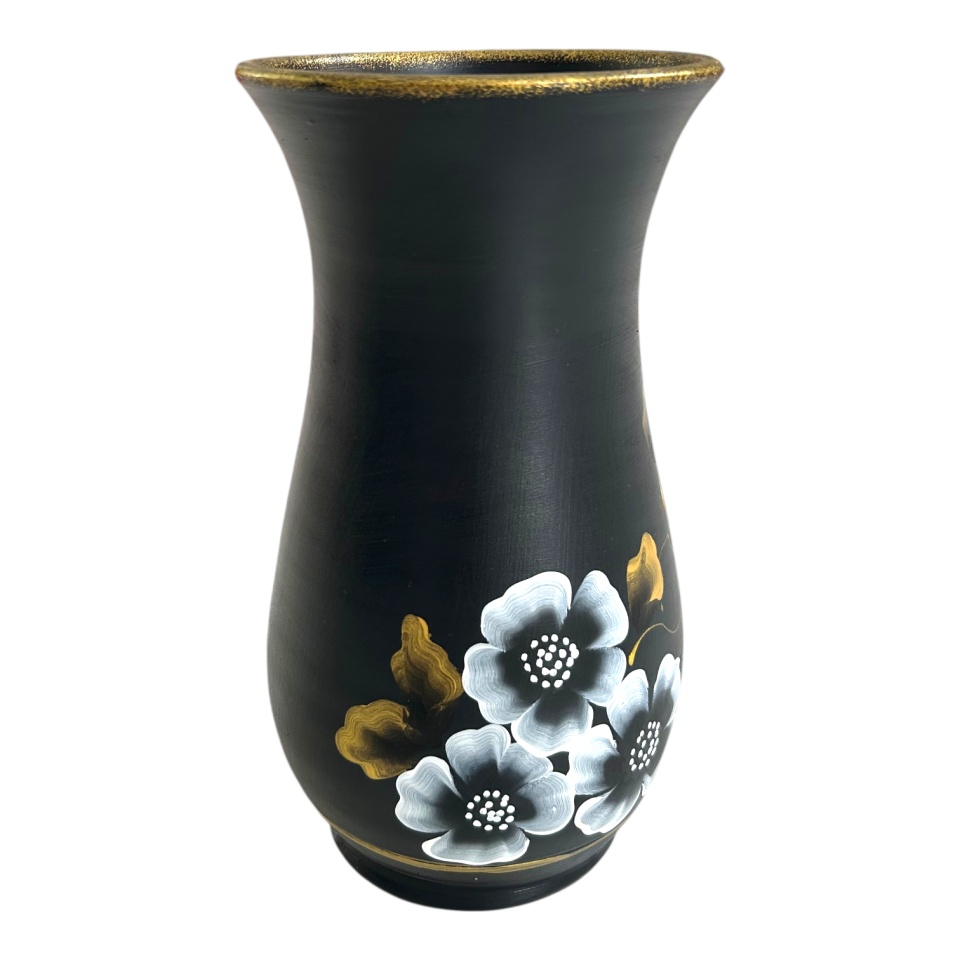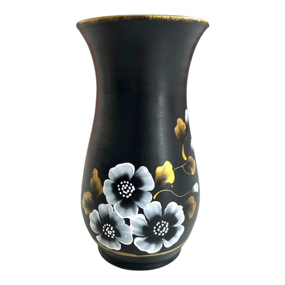 Această vază neagră, cu o înălțime de 25 cm, impresionează prin silueta sa elegantă și detaliile rafinate. Forma sa este alungită, iar gura ușor încrețită adaugă un efect decorativ subtil, dar de impact. Suprafața este accentuată cu detalii aurii aplicate manual, care completează fundalul închis și conferă obiectului un aer sofisticat și decorativ.
