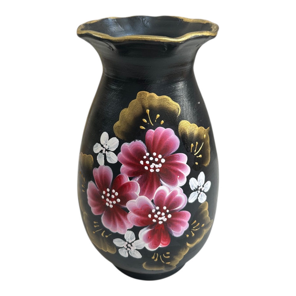 Această vază neagră, cu o înălțime de 25 cm, impresionează prin silueta sa elegantă și detaliile rafinate. Forma sa este alungită, iar gura ușor încrețită adaugă un efect decorativ subtil, dar de impact. Suprafața este accentuată cu detalii aurii aplicate manual, care completează fundalul închis și conferă obiectului un aer sofisticat și decorativ.