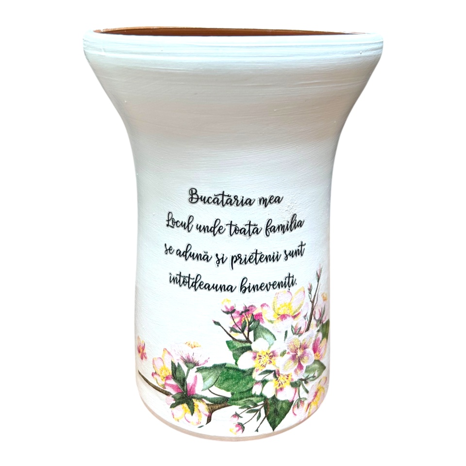 Ideală ca piesă decorativă pentru bucătărie sau living, această vază devine un punct de atracție discret, dar plin de semnificație. Fiecare exemplar este lucrat manual, ceea ce înseamnă că fiecare detaliu poartă amprenta autenticității.