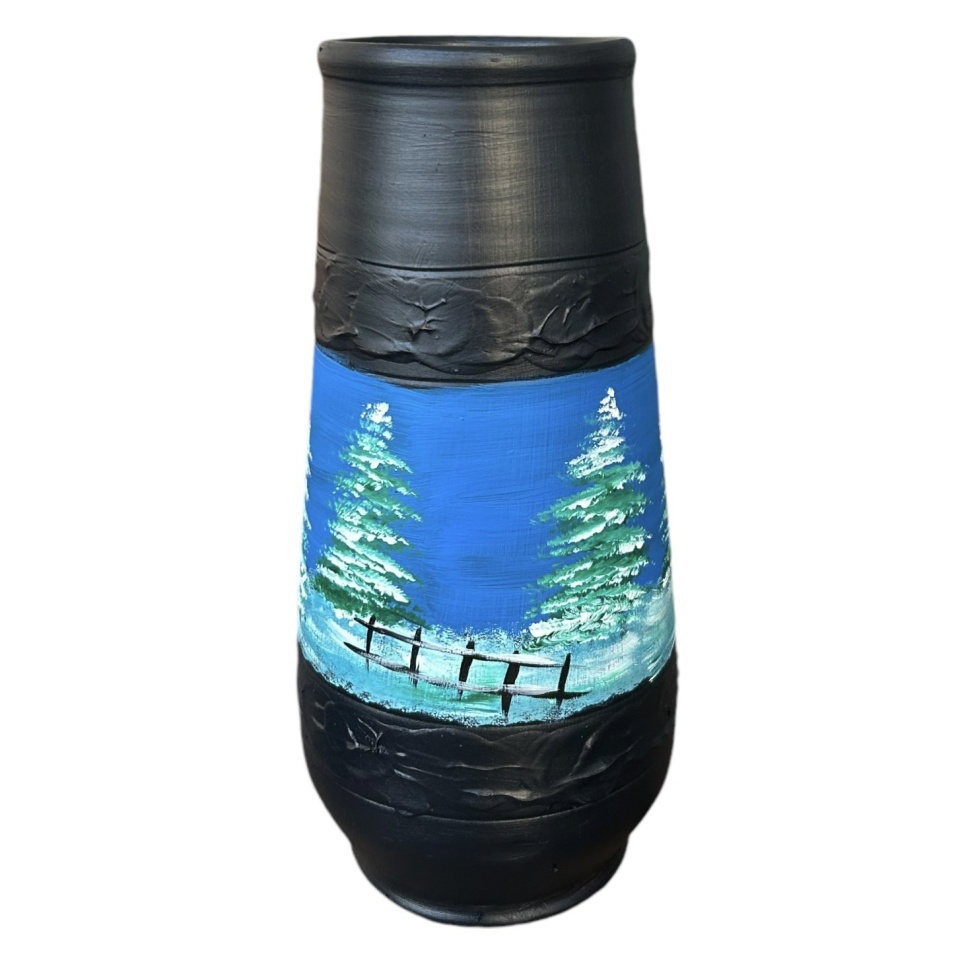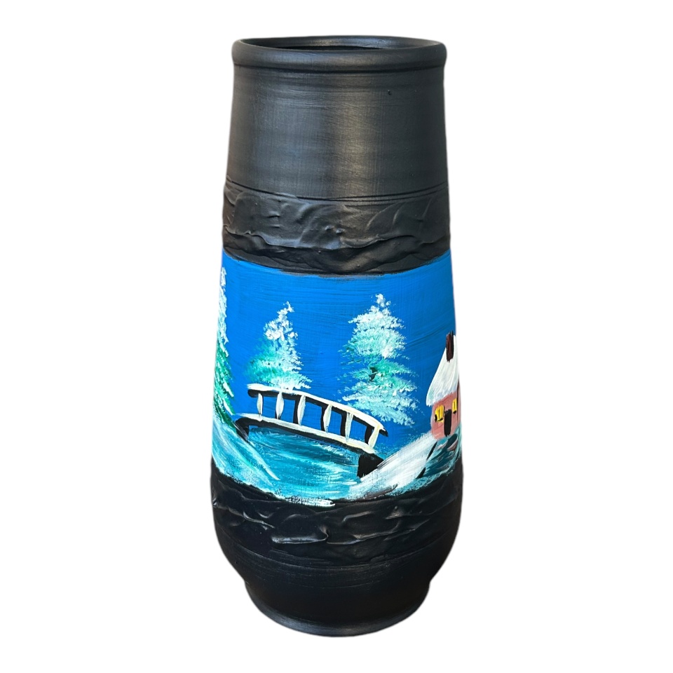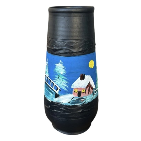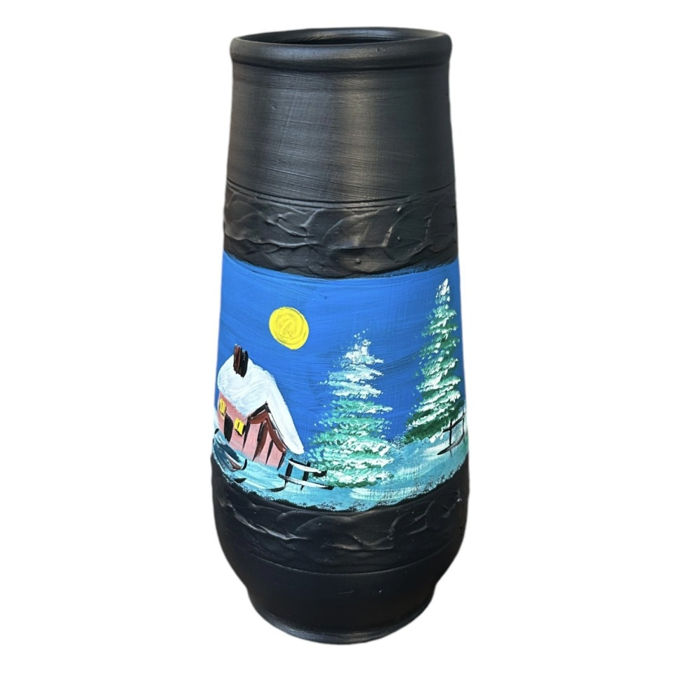 Această vază unică este realizată din ceramică de calitate și pictată manual în inima Bucovinei, oferind o notă autentică și tradițională. Designul său prezintă un peisaj idilic de iarnă, cu o căsuță acoperită de zăpadă, brazi înzăpeziți și un cer albastru sub clar de lună. Detaliile picturii adaugă un farmec cald și pitoresc, fiind ideală pentru a decora orice încăpere sau pentru a fi oferită cadou.